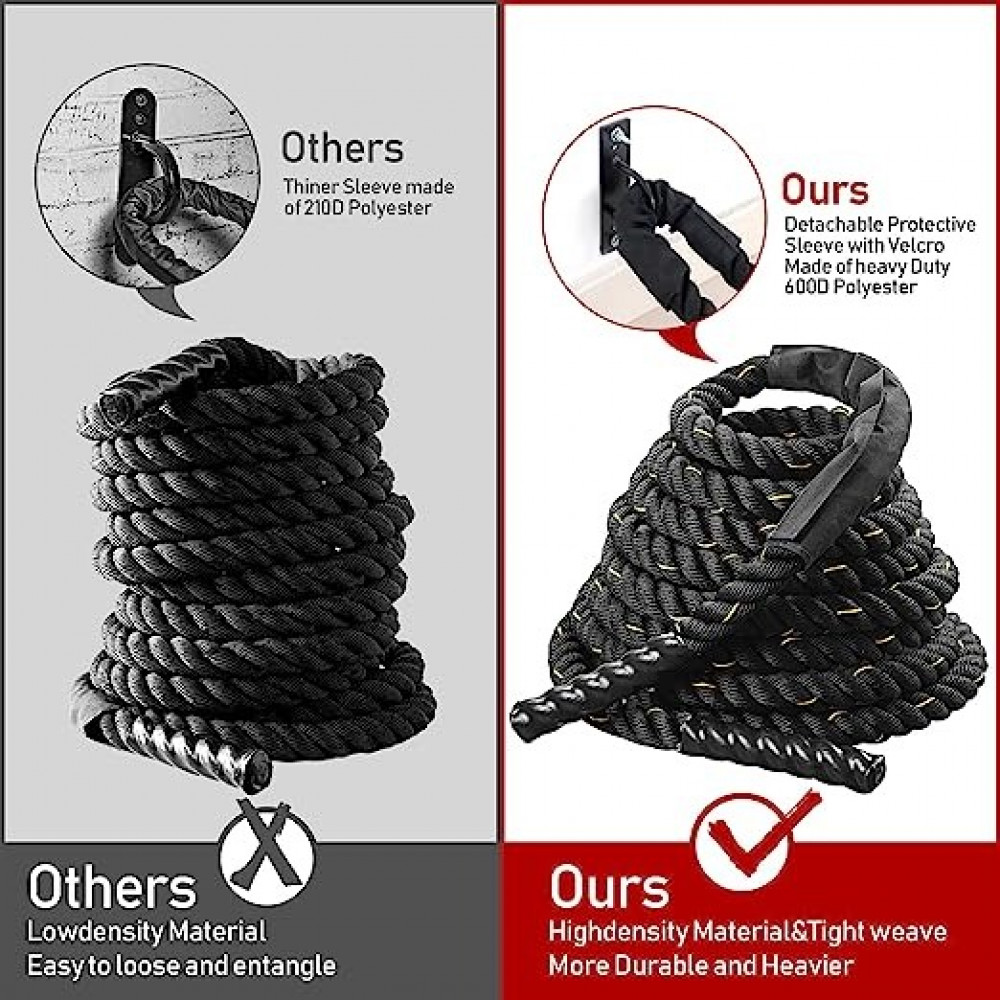- مادة متينة لأداء يدوم طويلاً - تضمن المواد الممتازة شديدة التحمل أن حبل المعركة الموزون لن يبدأ في الاهتراء أو تفكك بسهولة، حتى على الخرسانة. غطاء بوليستر 2000D يوفر حماية إضافية. مقابض طويلة مطلية تحمي يديك وتمنحك قبضة آمنة لجميع التدريبات والتمارين! حبل المعركة الثقيلة الخاص بنا أقوى من أقوى التمارينات.